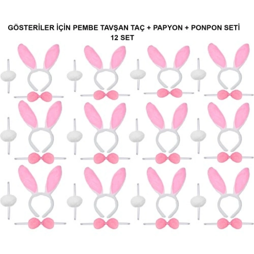 Pembe Tavşan Kostüm Seti – 12’li Paket (Taç + Papyon + Ponpon)Çocuklar için sevimli ve eğlenceli bir kostüm alternatifi sunan pembe tavşan kostüm seti, şirin tasarımıyla miniklerin hayal dünyasına renk katar. Özellikle 23 Nisan, okul gösterileri, doğum günü partileri ve kostüm etkinliklerinde tercih edilen bu set, sahnede ve etkinliklerde dikkat çekici bir görünüm oluşturur.Set içerisinde yer alan tavşan kulaklı taç, peluş kaplamalı yapısı ve pembe-beyaz renkleriyle konforlu bir kullanım sunar. Papyon, ayarlanabilir lastikli yapısı sayesinde kolayca takılır ve pratik bir kullanım sağlar. Ponpon kuyruk ise elastik bantlı tasarımı ile rahatça takılıp çıkarılabilir. Tüm parçalar yumuşak ve hafif malzemeden üretilmiştir, çocukların hareket özgürlüğünü kısıtlamaz.12’li paket içeriği sayesinde okul gösterileri, toplu sahne performansları, tiyatro etkinlikleri ve grup organizasyonları için oldukça uygundur. Pembe tavşan kostüm seti, hem eğlenceli hem de konforlu yapısıyla çocukların keyifle kullanabileceği ideal bir kostüm çözümüdür.
