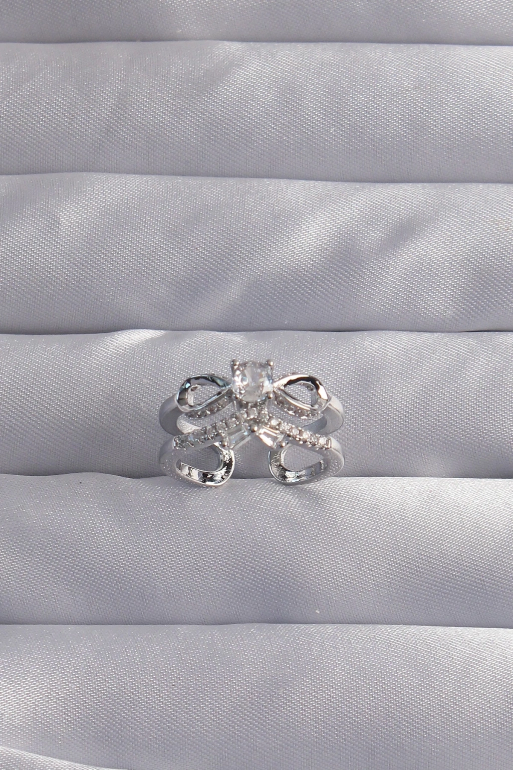 Pirinç Ayarlamalı Gümüş Renk Zirkon Taşlı 2li Görünüm Fiyonk Yüzük - TJ-BYK3288