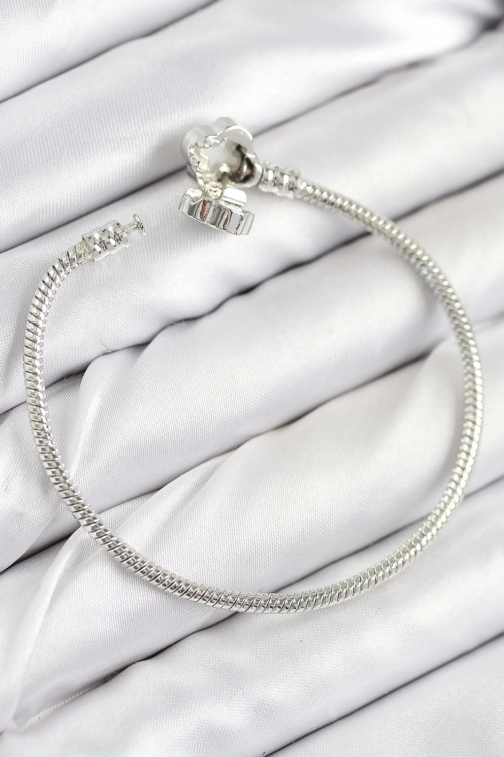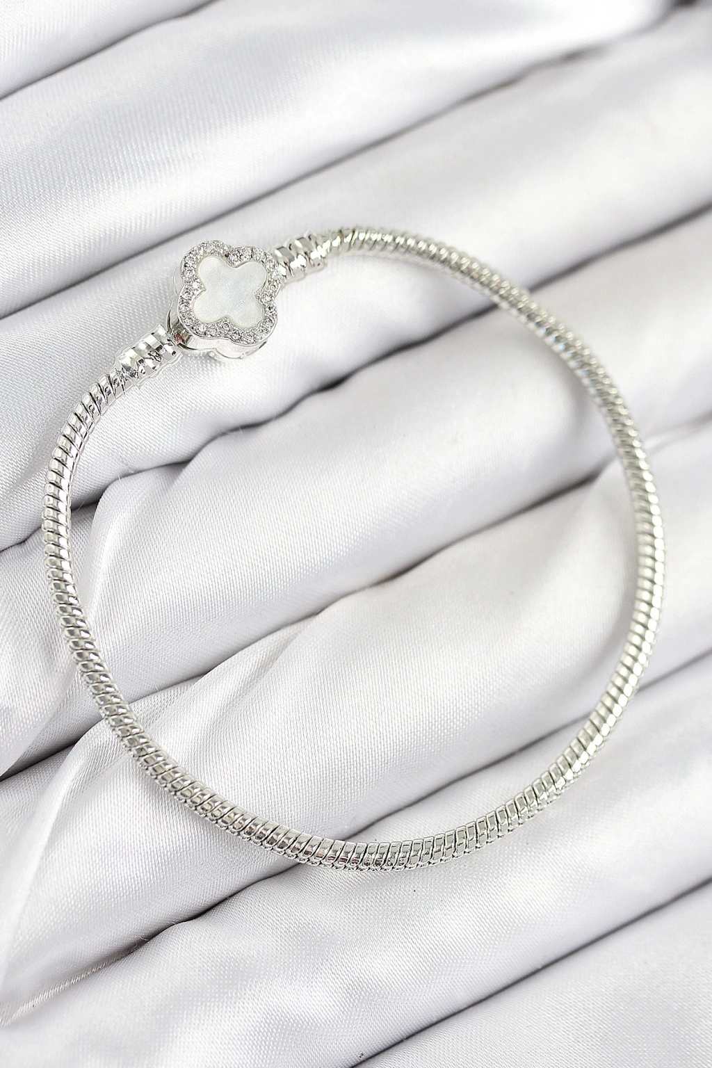 Pirinç Charm Zirkon Taşlı Yonca Model Gümüş Renk Kadın Bileklik - TJ-BB7799