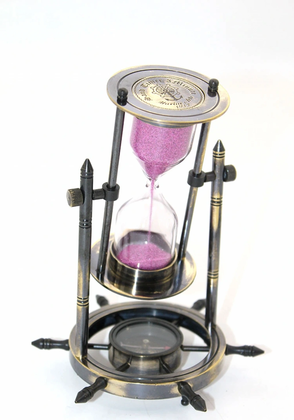 PİRİNÇ DÜMENLİ PUSULALI KUM SAATİÜrün ÖzellikleriPirinç dümenli pusulalı kum saati, klasik ve denizcilik temalı tasarımıyla dekoratif bir obje olarak öne çıkmaktadır. Gövdesi dayanıklı pirinç malzemeden üretilmiş olup, alt kısmında pusula detayı bulunmaktadır. Kum saati döner mekanizmaya sahip olup, nostaljik bir zaman ölçme aracı olarak işlevseldir. Antik eskitme görünümü ile ofis, çalışma masası veya ev dekorasyonu için idealdir.Paket İçeriği1 Adet Pirinç Dümenli Pusulalı Kum Saati