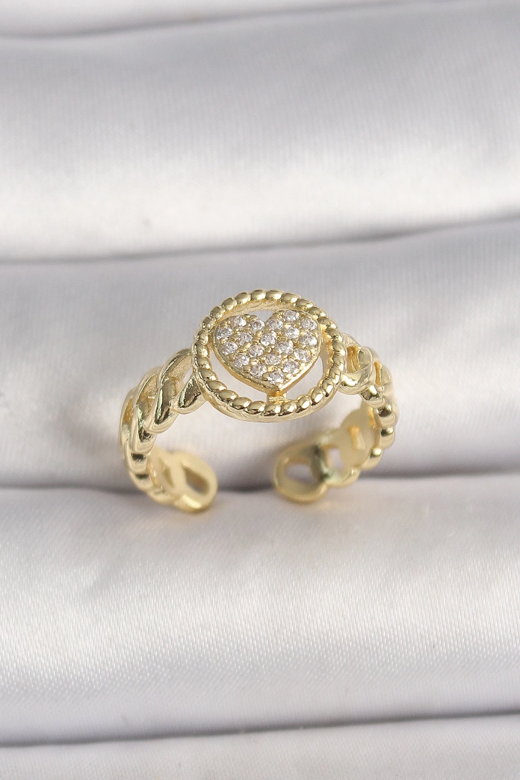 Pirinç Gold Renk Ayarlanabilir Zirkon Taşlı Kalp Model Kadın Yüzük - TJ-BYK3604