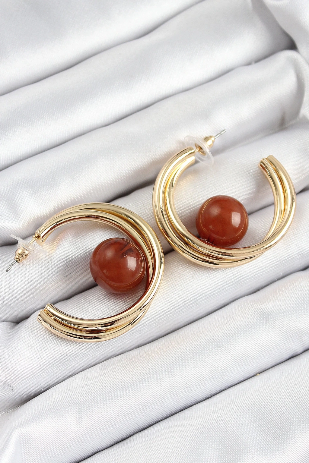 Pirinç Gold Renk Halka Model Kahverengi Boncuk Detay Kadın Küpe - TJ-BKP10364