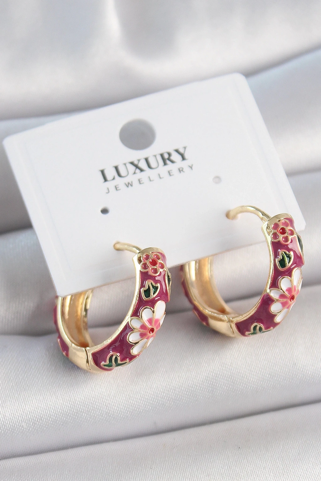 Pirinç Gold Renk Halka Mor Çiçek Mineli Kadın Küpe - TJ-BKP10474