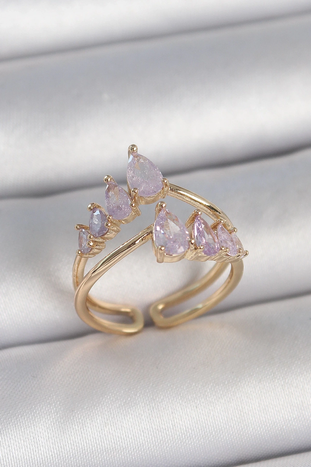 Pirinç Gold Renk Mor Damla Zirkon Taşlı Taç Model Kadın Yüzük - TJ-BYK3715