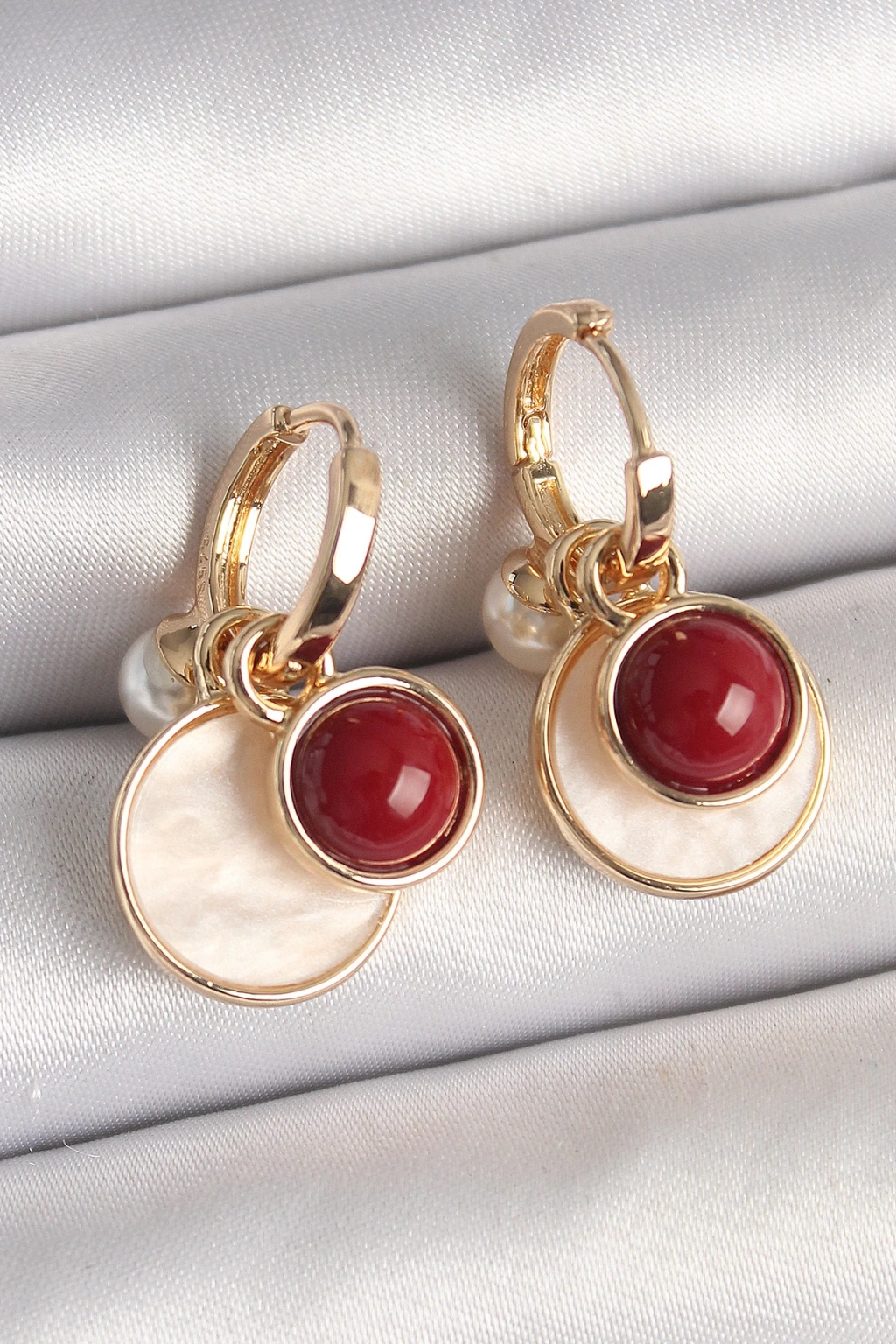 Pirinç Gold Renk Sallantı Beyaz Mineli Bordo Detay Kadın Küpe - TJ-BKP10362