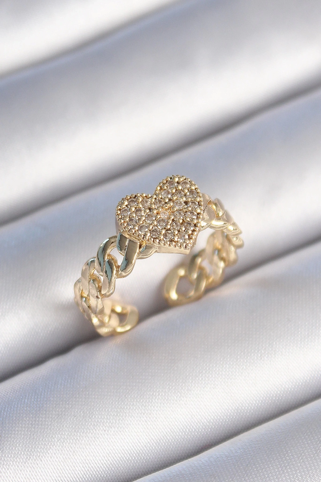 Pirinç Gold Renk Zincir Kordon Zirkon Taşlı Kalp Model Kadın Yüzük - TJ-BYK3485
