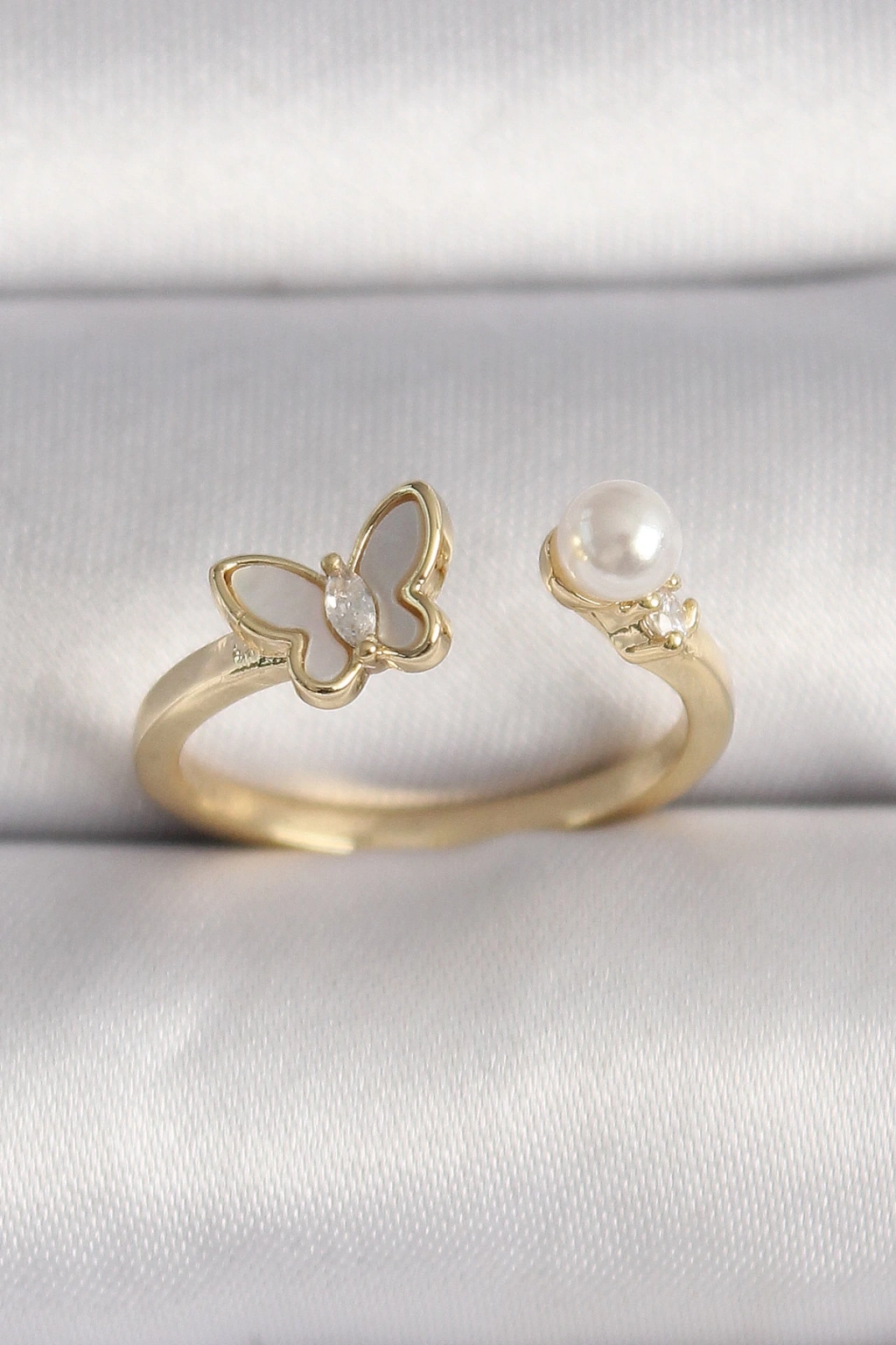 Pirinç Gold Renk Zirkon Taş Detaylı Beyaz Mineli Kelebek Model İnci Detay Ayarlanabilir Yüzük - TJ-BYK3523