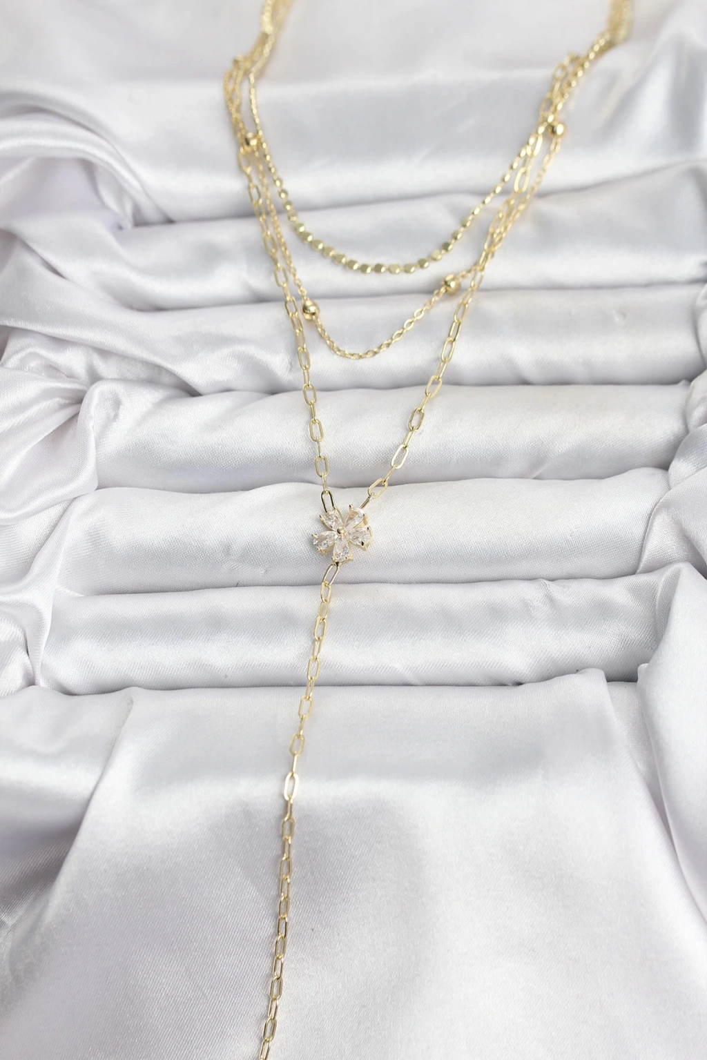 Pirinç Gold Renk Zirkon Taşlı Çiçek Model Detaylı 3'lü Kombin Y Kadın Kolye - TJ-BKO10697
