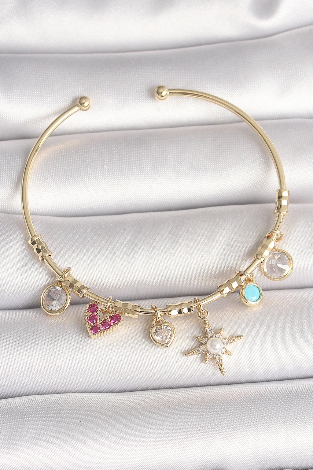 Pirinç Gold Renk Zirkon Taşlı Sallantı Kutup Yıldız Figür İnci Detay Charm Kadın Bileklik - TJ-BB6887