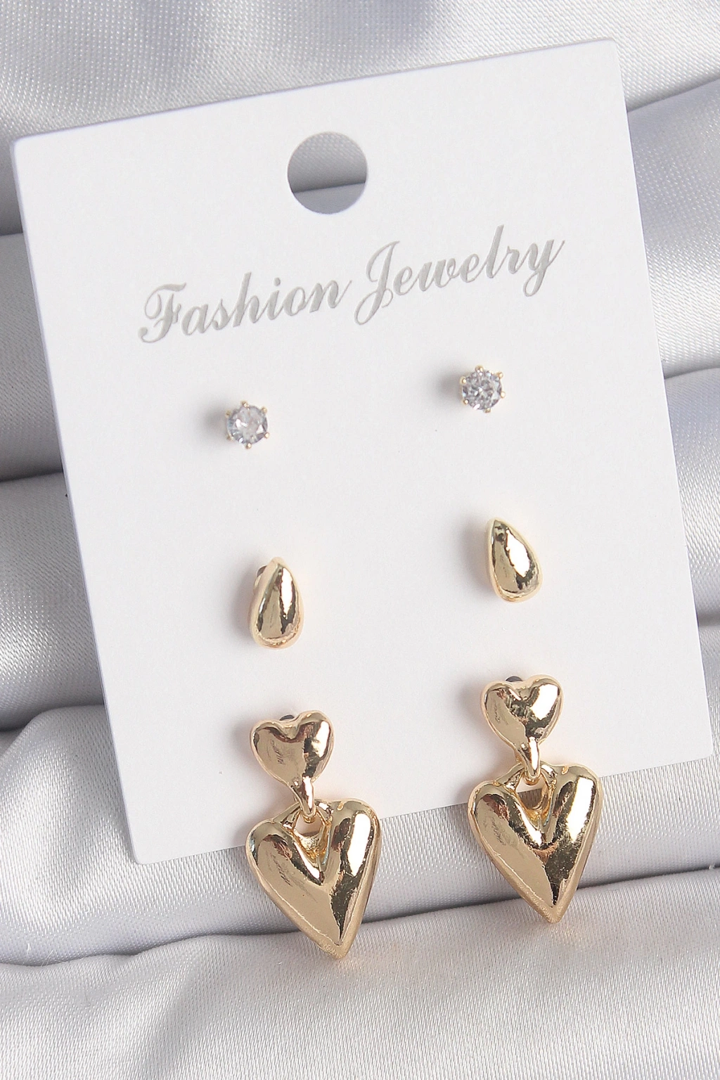 Pirinç Gold Renk Zirkon Taşlı Sallantılı Kalp Model 3 Çift Kadın Küpe Seti - TJ-BKP10610
