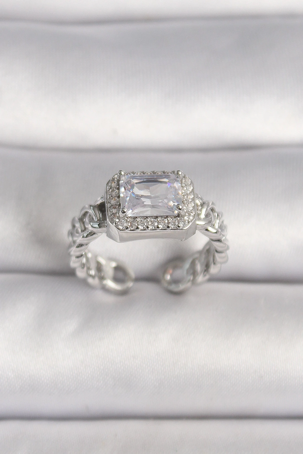 Pirinç Gümüş Renk Ayarlanabilir Zincir Kare Zirkon Taşlı Kadın Yüzük - TJ-BYK3583