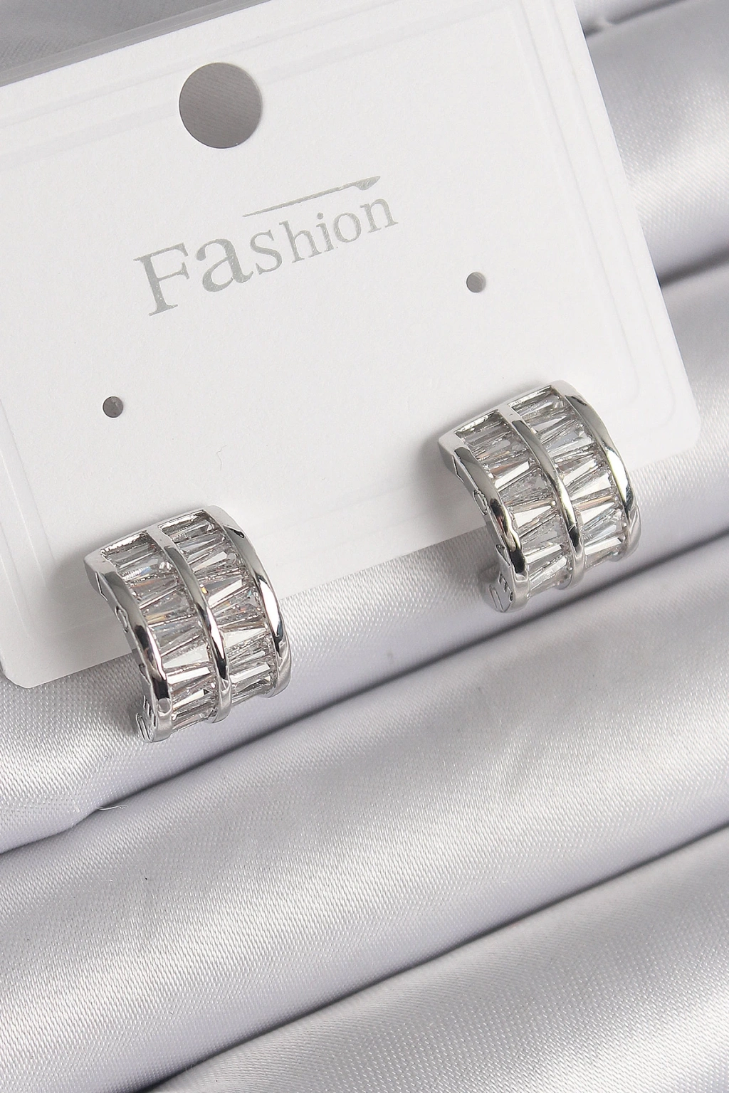 Pirinç Gümüş Renk Çift Sıra Zirkon Taşlı Kadın Küpe - TJ-BKP9755
