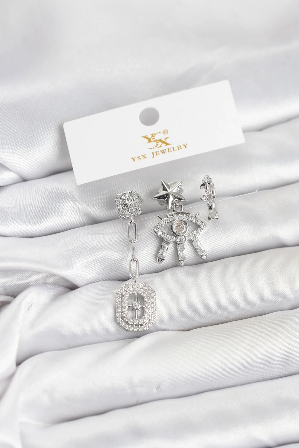Pirinç Gümüş Renk Göz ve Kutup Yıldızı Model YSX Trio Küpe Seti - TJ-BKP11557