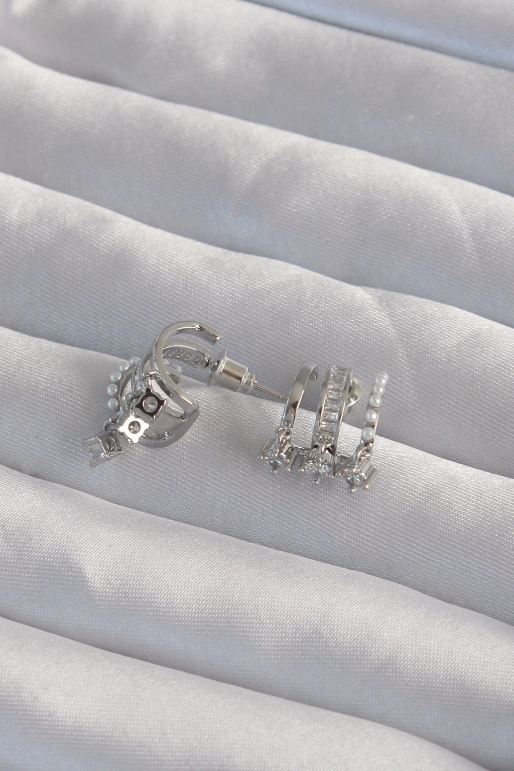 Pirinç Gümüş Renk İncili Çoklu Zirkon Taşlı Yarım Halka Küpe - TJ-BKP9316