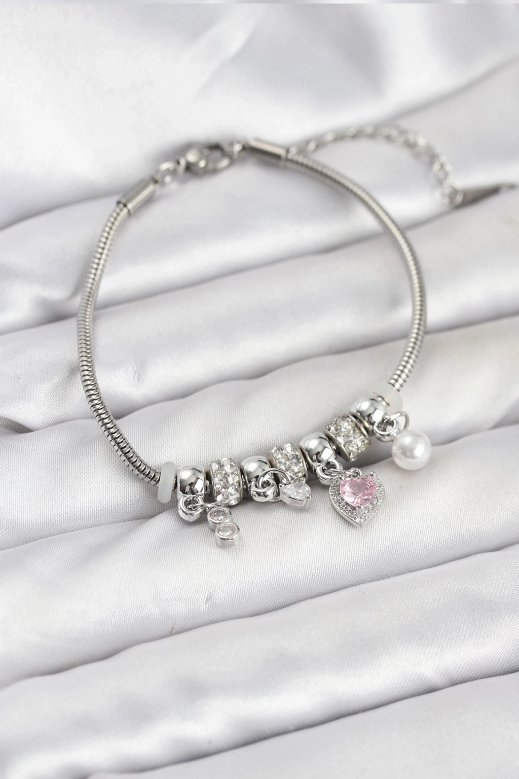 Pirinç Gümüş Renk Pembe Kalp Charmlı Kadın Bileklik - TJ-BB8190