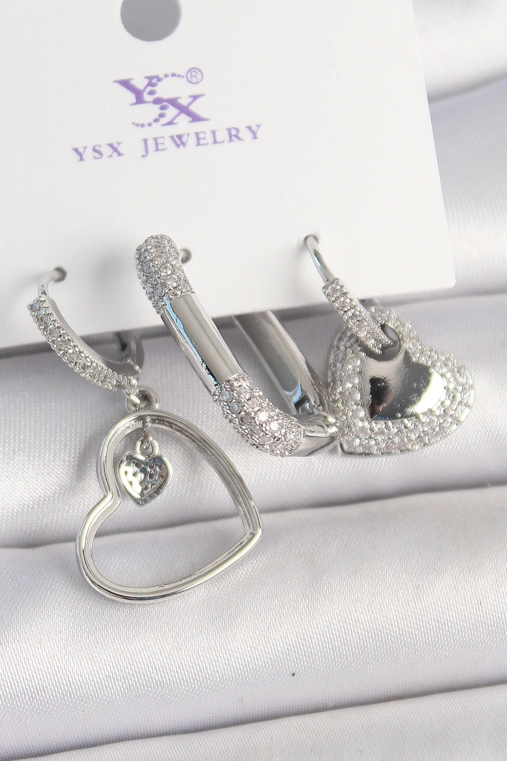 Pirinç Gümüş Renk Sallantı Zirkon Taşlı Kalp Model 3'Lü Kadın Kombin Küpe - TJ-BKP10442
