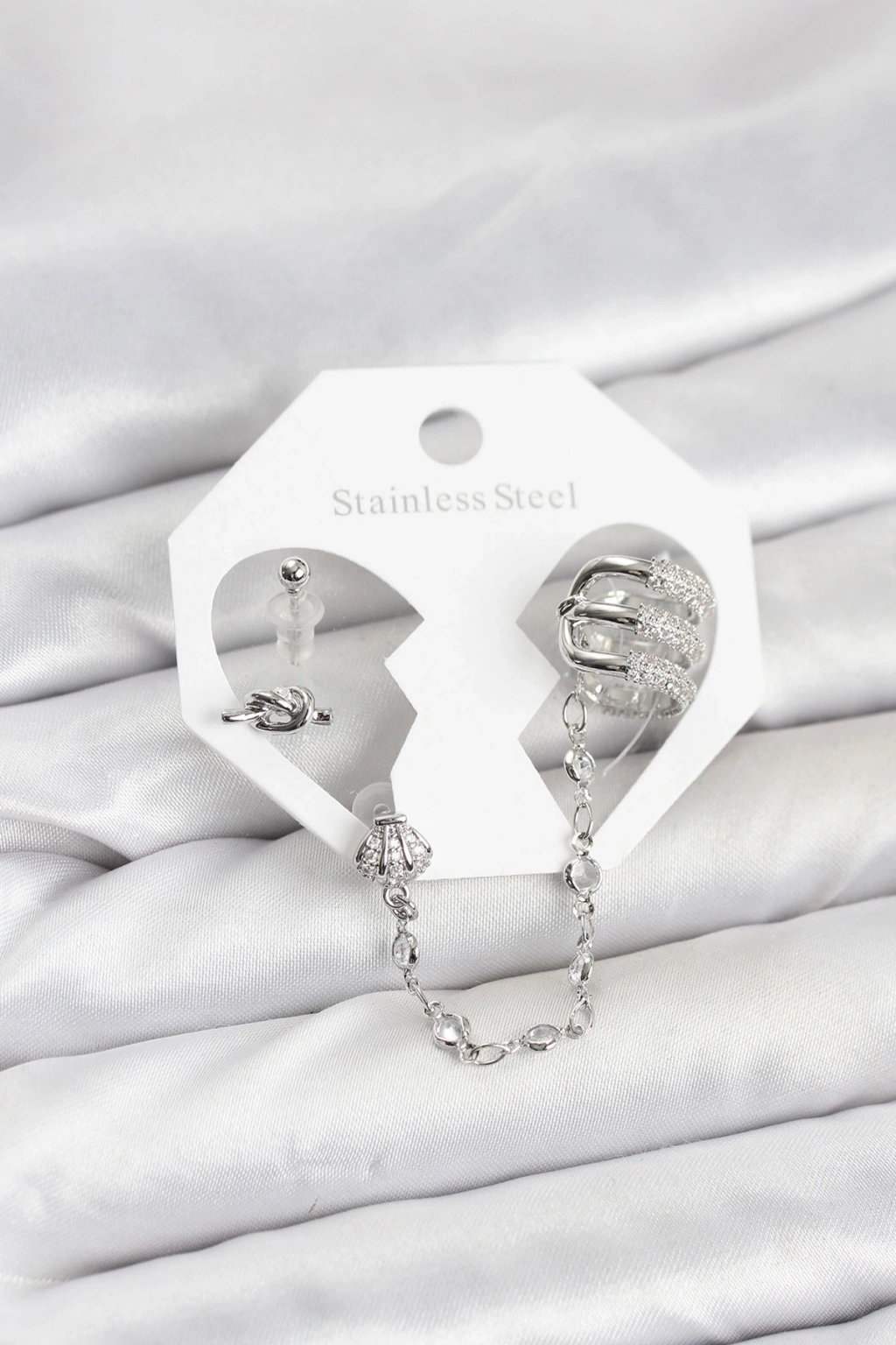 Pirinç Gümüş Renk Sarmal Model Zincir Bağlantılı Ear Cuff Küpe Seti - TJ-BKP11537