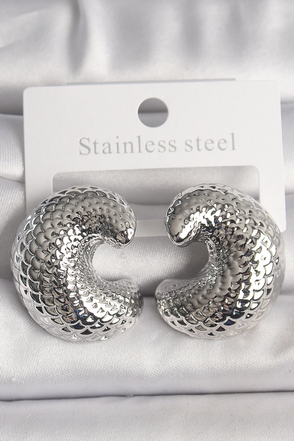 Pirinç Gümüş Renk Yılan Sırtı İşlemeli Yarım Halka Model Kadın Küpe - TJ-BKP10158
