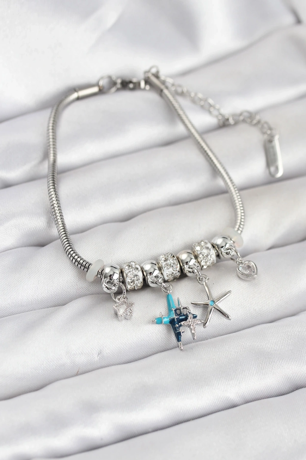 Pirinç Gümüş Renk Yıldız Model Charmlı Kadın Bileklik - TJ-BB8200