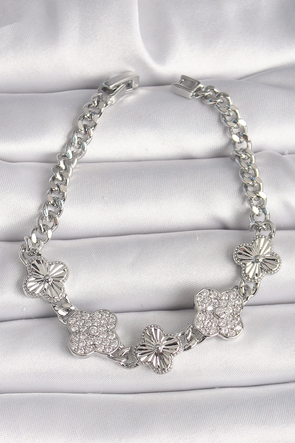 Pirinç Gümüş Renk Zincir Yonca Model Kadın Bileklik - TJ-BB6837
