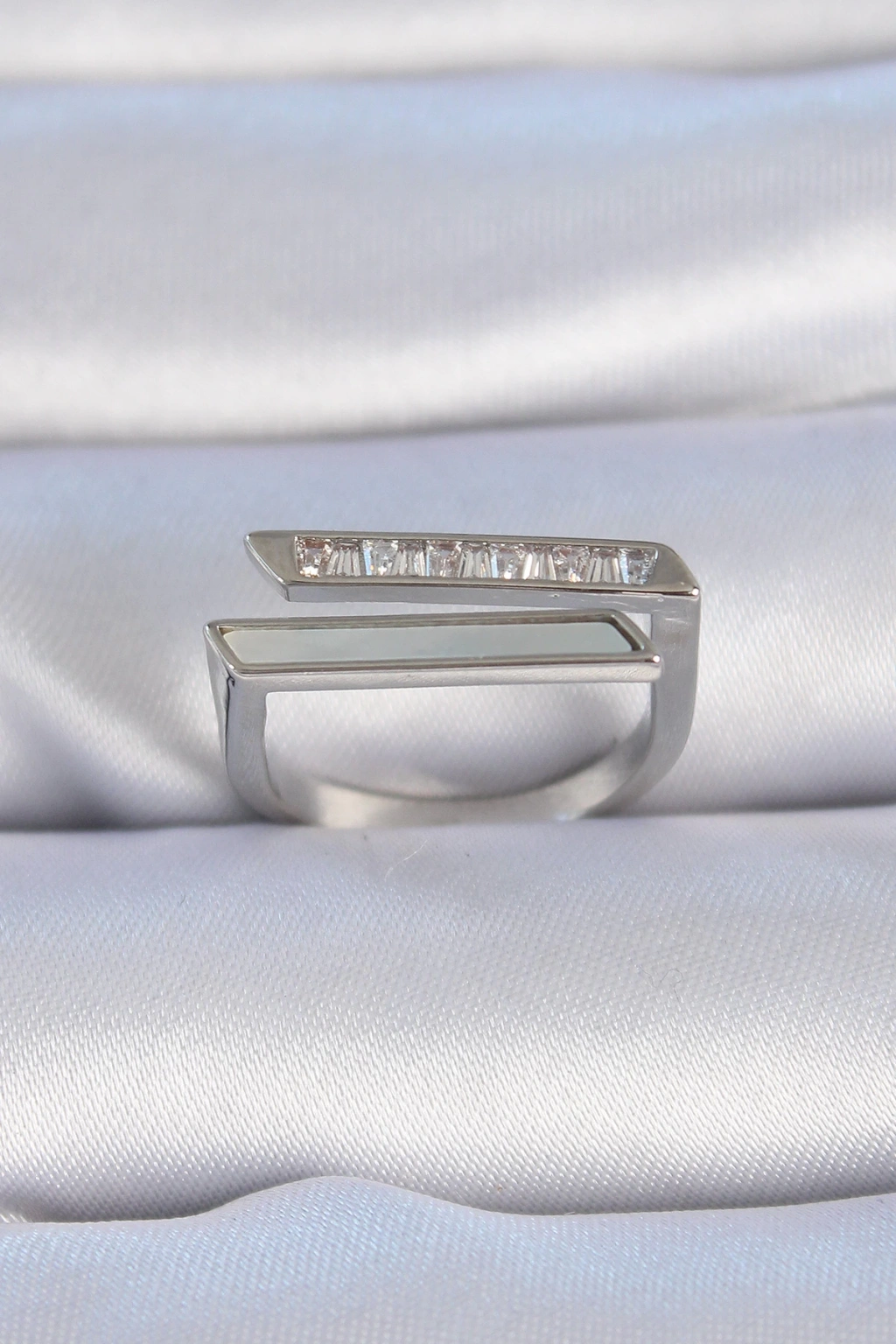 Pirinç Gümüş Renk Zirkon Taşlı Beyaz Sedef Detay Kadın Yüzük - TJ-BYK3349