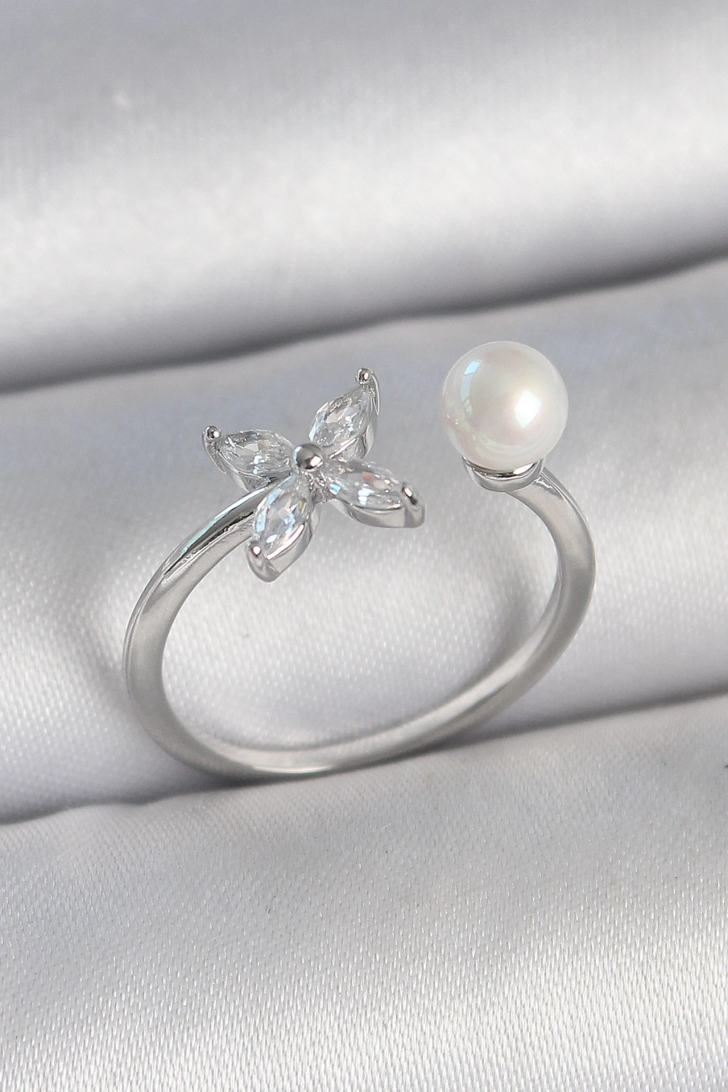 Pirinç Gümüş Renk Zirkon Taşlı Çiçek Model İnci Detay Ayarlanabilir Kadın Yüzük - TJ-BYK3726