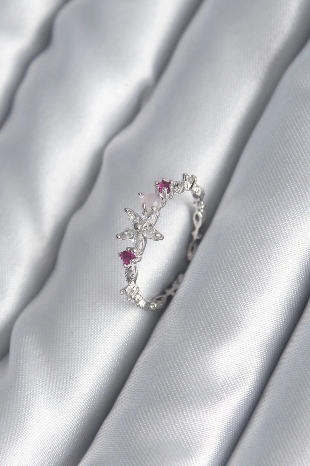 Pirinç Gümüş Renk Zirkon Taşlı Çiçek Model Pembe Zirkon Taş Detay Kadın Yüzük - TJ-BYK2984
