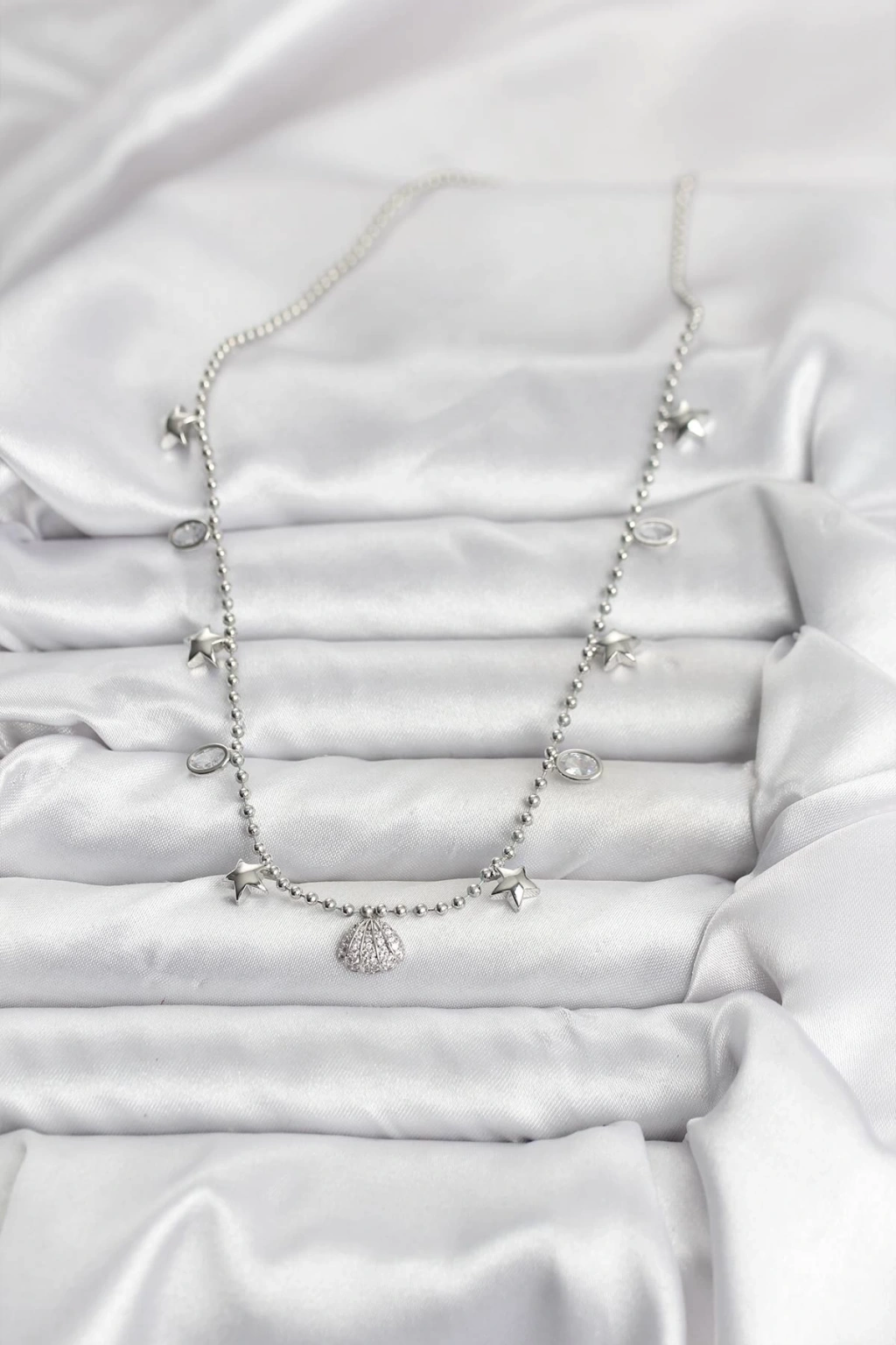 Pirinç Gümüş Renk Zirkon Taşlı Deniz Kabuğu Model Kadın Kolye - TJ-BKO10656