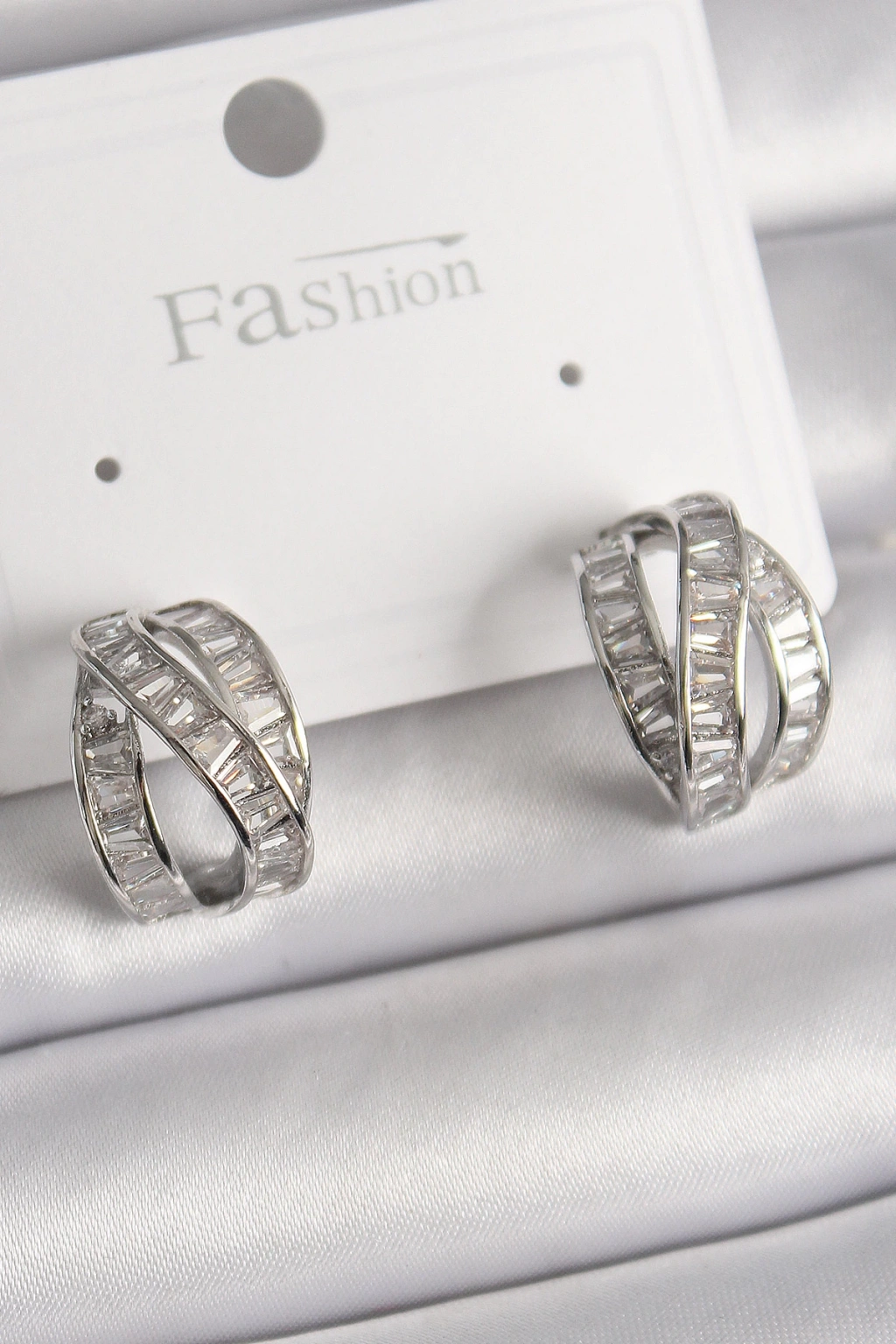Pirinç Gümüş Renk Zirkon Taşlı Düğüm Halka Model Kadın Küpe - TJ-BKP9944