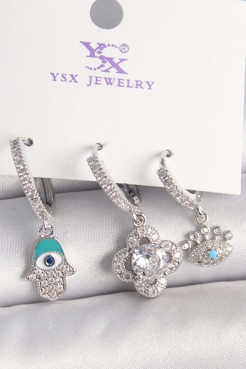 Pirinç Gümüş Renk Zirkon Taşlı Fatma Ana Yonca Figür Göz Detay 3'Lü Kadın Kombin Küpe - TJ-BKP10450