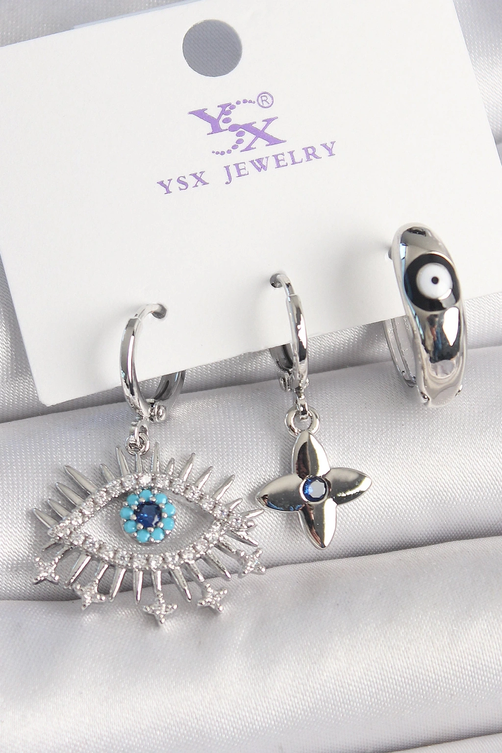 Pirinç Gümüş Renk Zirkon Taşlı Göz Model Nazar Boncuk Detay 3'Lü Kadın Kombin Küpe - TJ-BKP10440