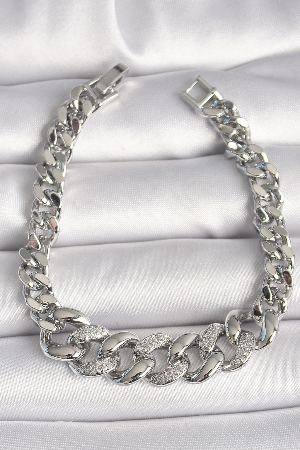 Pirinç Gümüş Renk Zirkon Taşlı Kalın Halka Model Kadın Bileklik - TJ-BB6854