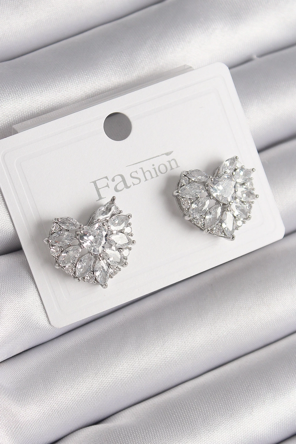 Pirinç Gümüş Renk Zirkon Taşlı Kalp Model Kadın Küpe - TJ-BKP9749