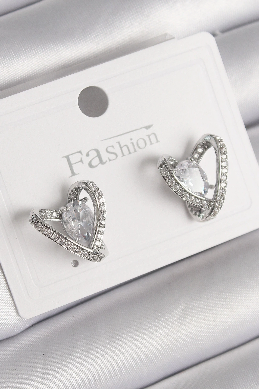 Pirinç Gümüş Renk Zirkon Taşlı Kalp Model Kadın Küpe - TJ-BKP9759
