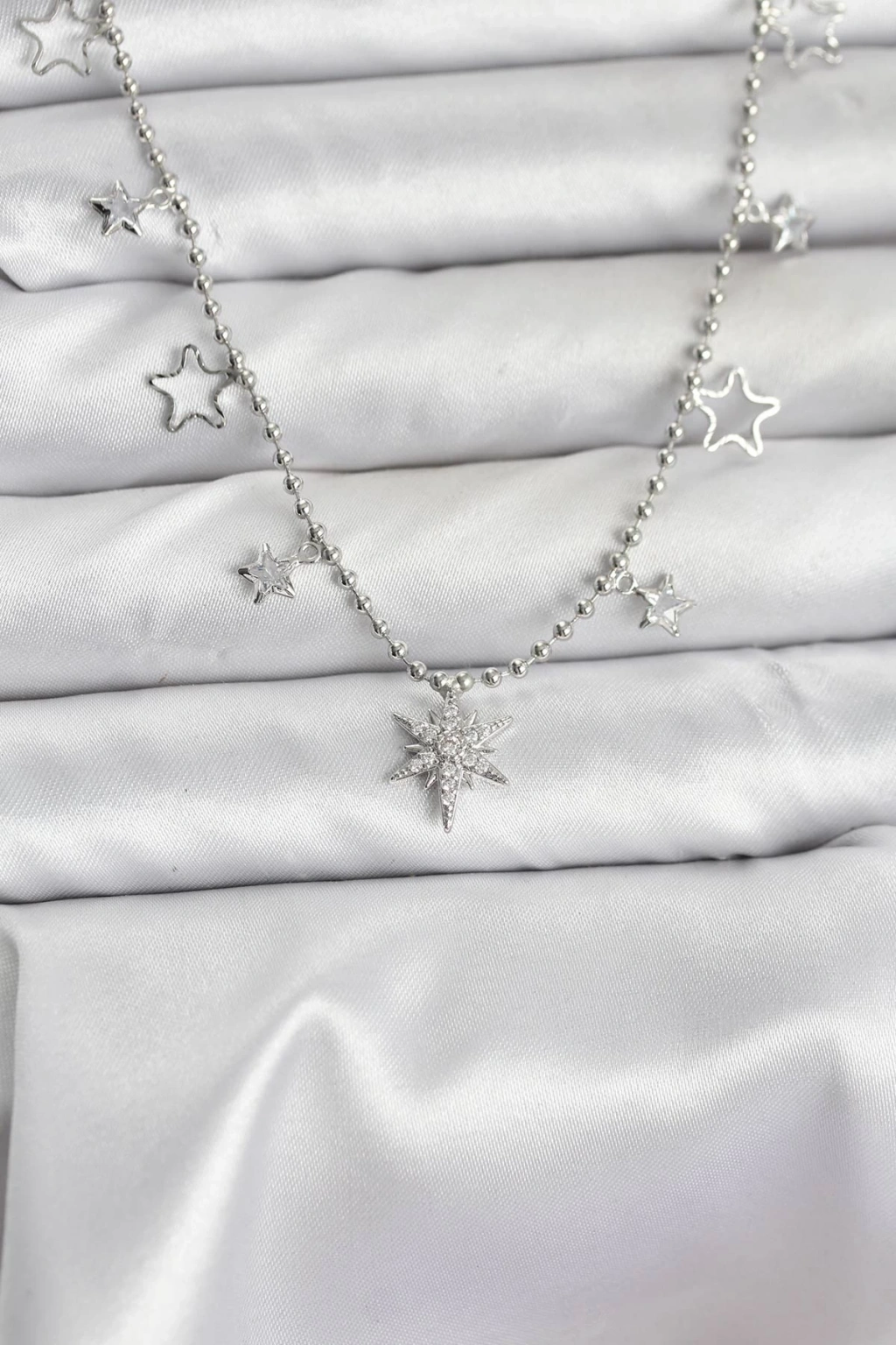 Pirinç Gümüş Renk Zirkon Taşlı Kutup Yıldızı Model Kadın Kolye - TJ-BKO10659