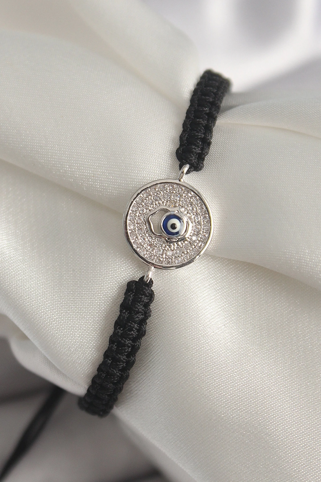 Pirinç Gümüş Renk Zirkon Taşlı Nazar Boncuk İşleme Makrome Asansörlü Model Kadın Bileklik - TJ-BB6787