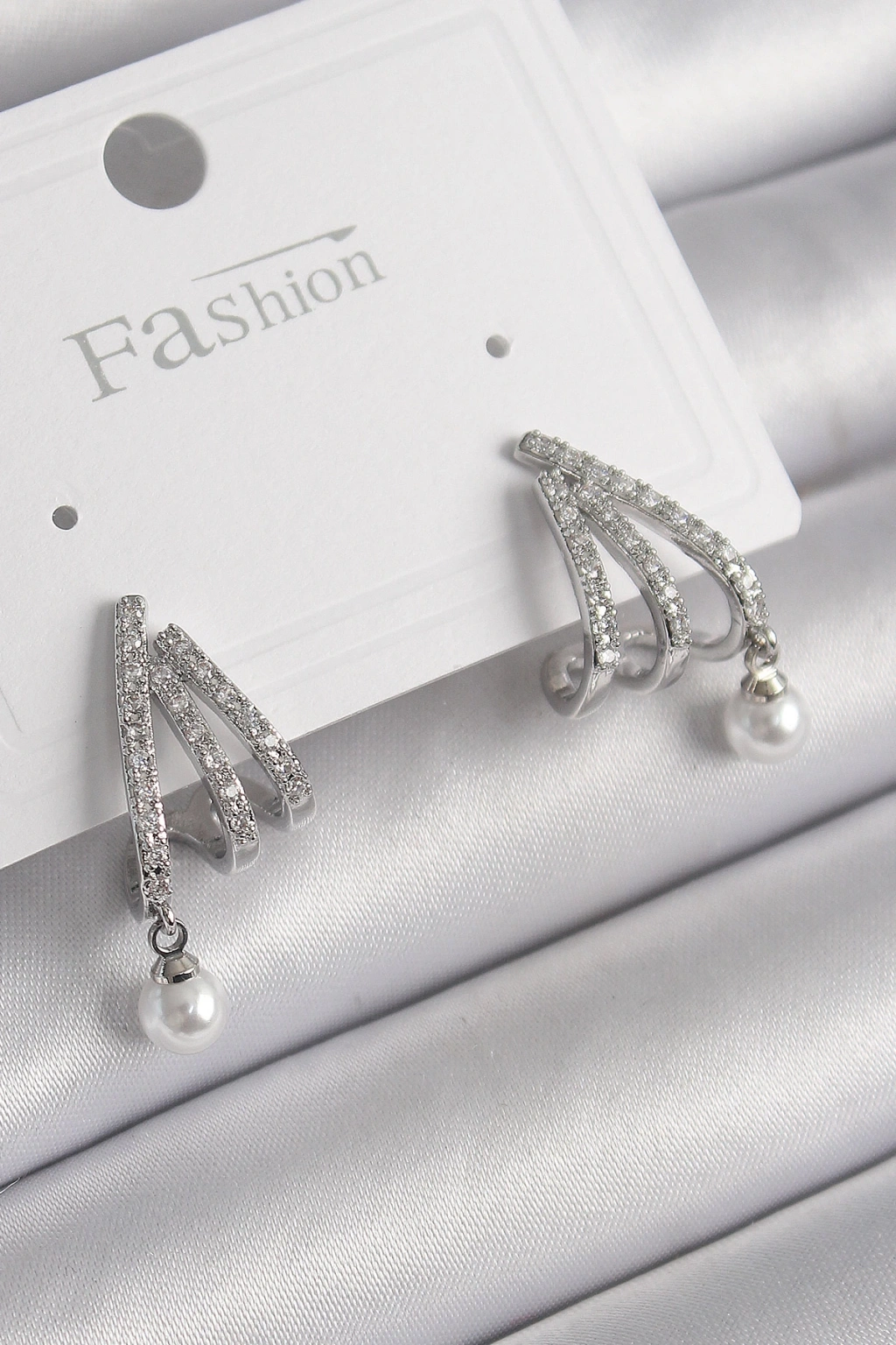 Pirinç Gümüş Renk Zirkon Taşlı Pençe Model İnci Detay Kadın Küpe - TJ-BKP9958
