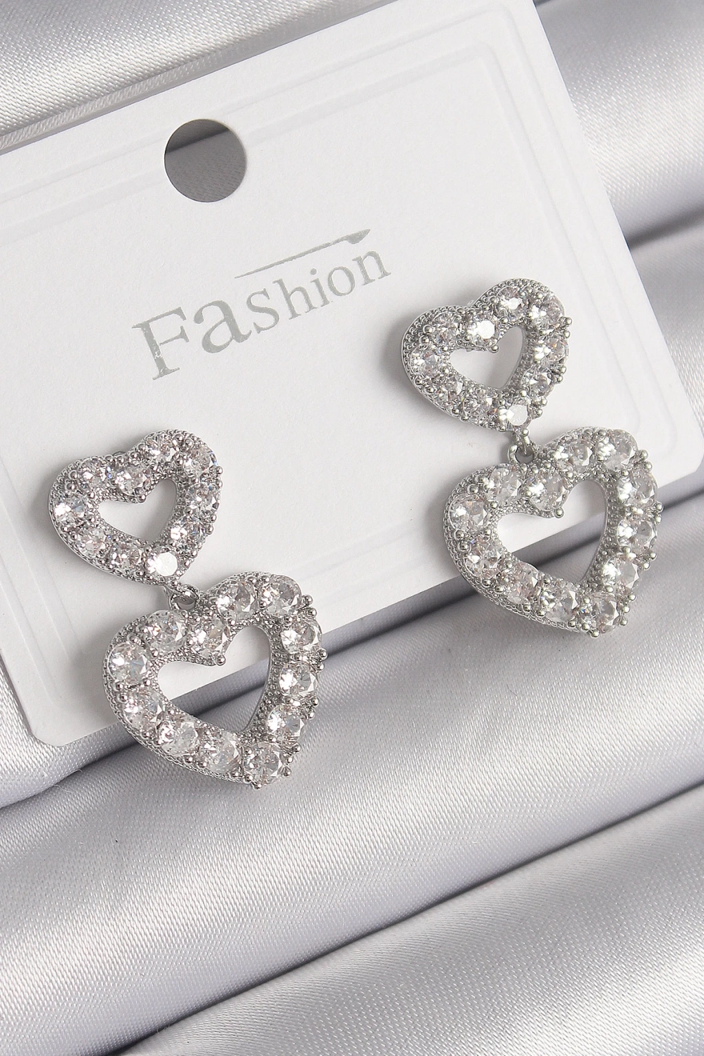 Pirinç Gümüş Renk Zirkon Taşlı Sallantı Kalp Model Kadın Küpe - TJ-BKP9765
