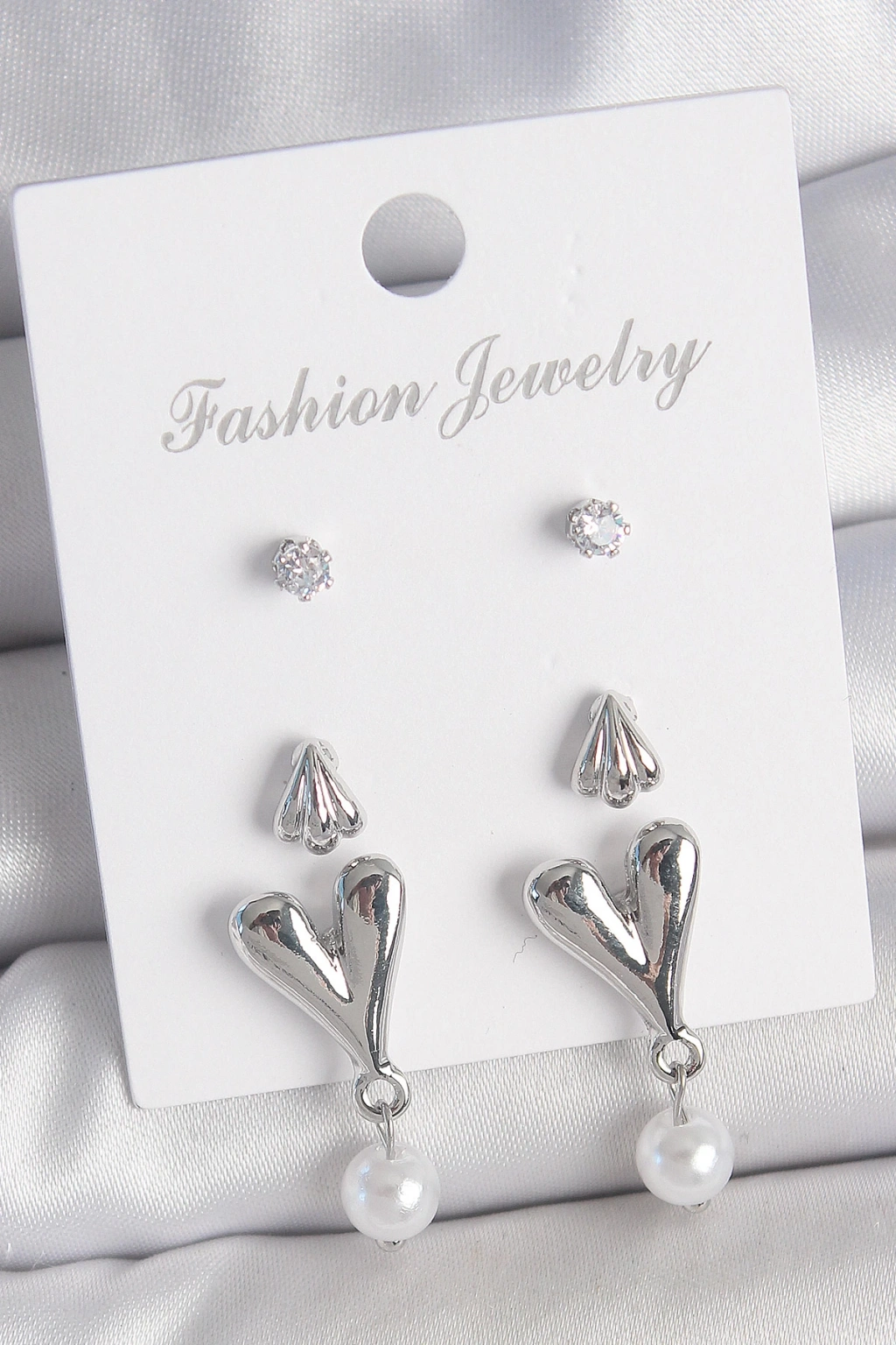 Pirinç Gümüş Renk Zirkon Taşlı Sallantılı Kalp Model 3 Çift Kadın Küpe Seti - TJ-BKP10590
