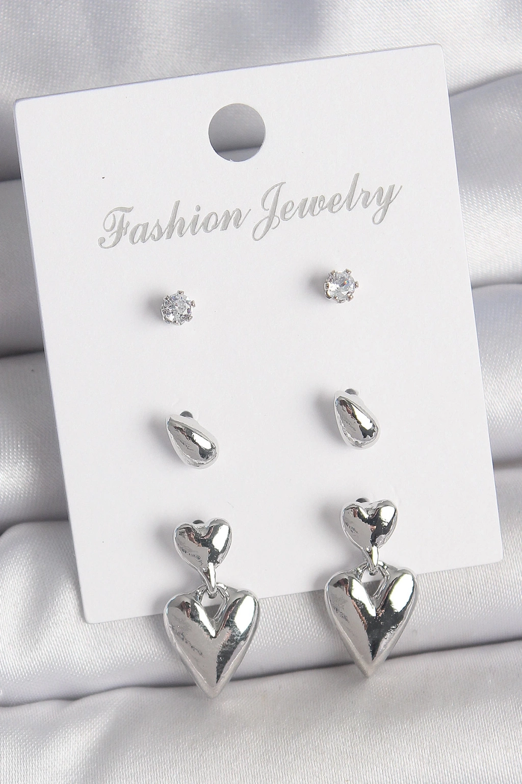 Pirinç Gümüş Renk Zirkon Taşlı Sallantılı Kalp Model 3 Çift Kadın Küpe Seti - TJ-BKP10592