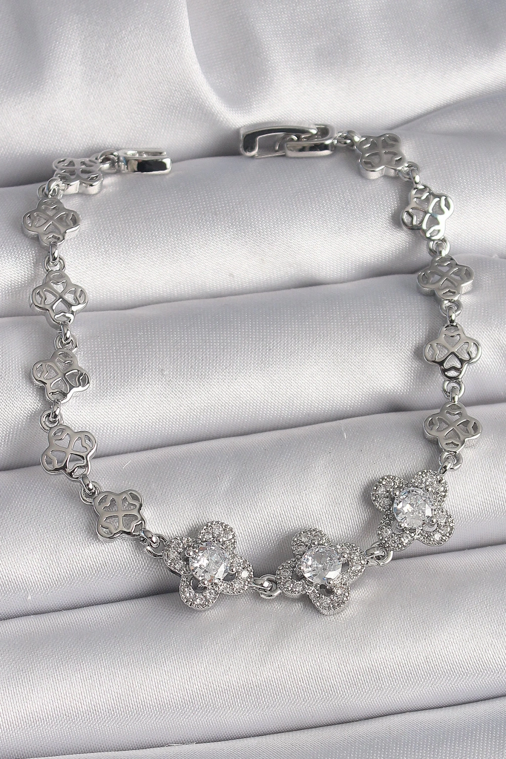 Pirinç Gümüş Renk Zirkon Taşlı Yonca Model Kadın Bileklik - TJ-BB6813