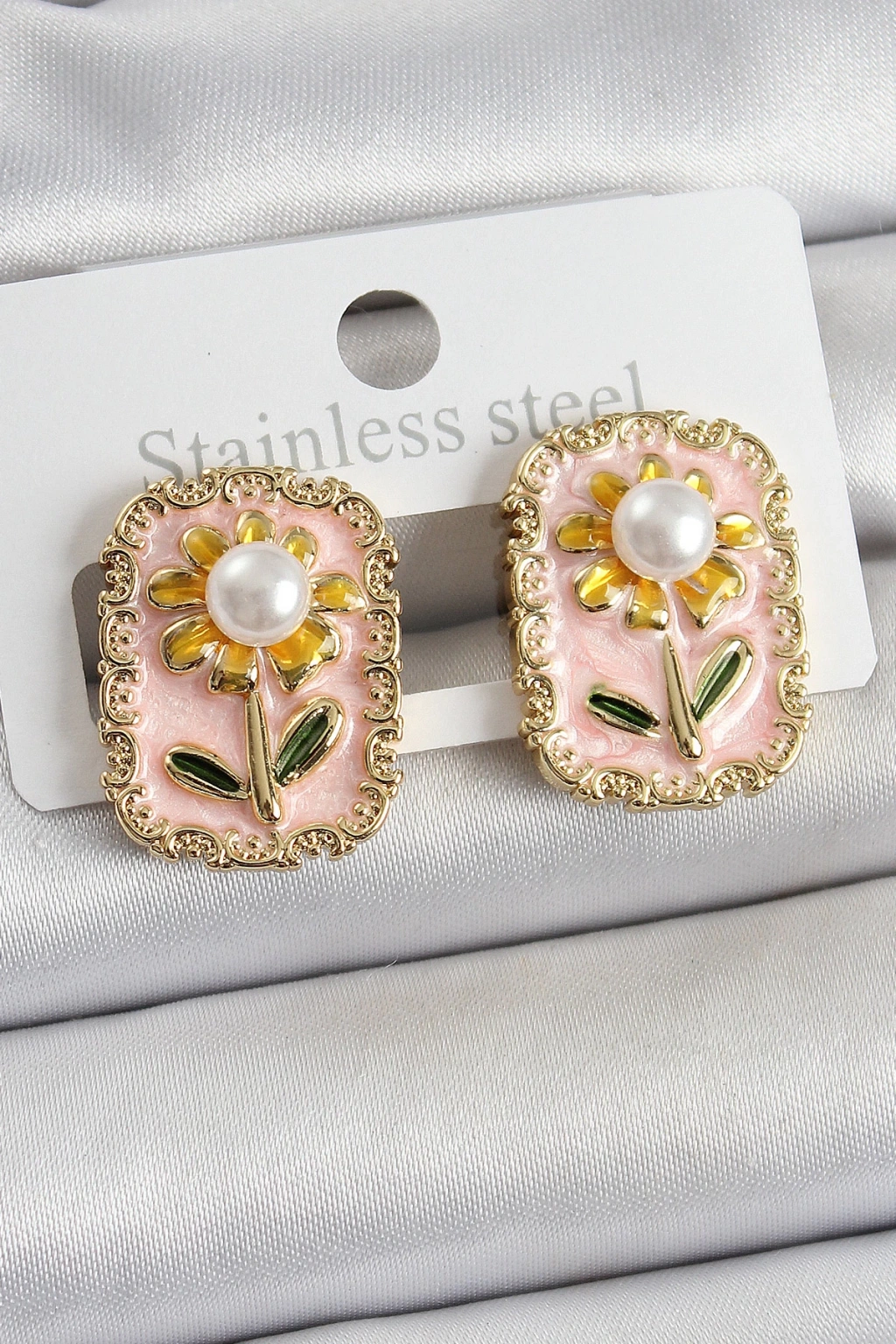 Pirinç Pembe Mineli Papatya Figürlü Sanatsal Portre Model Gold Renk Kadın Küpe - TJ-BKP10687