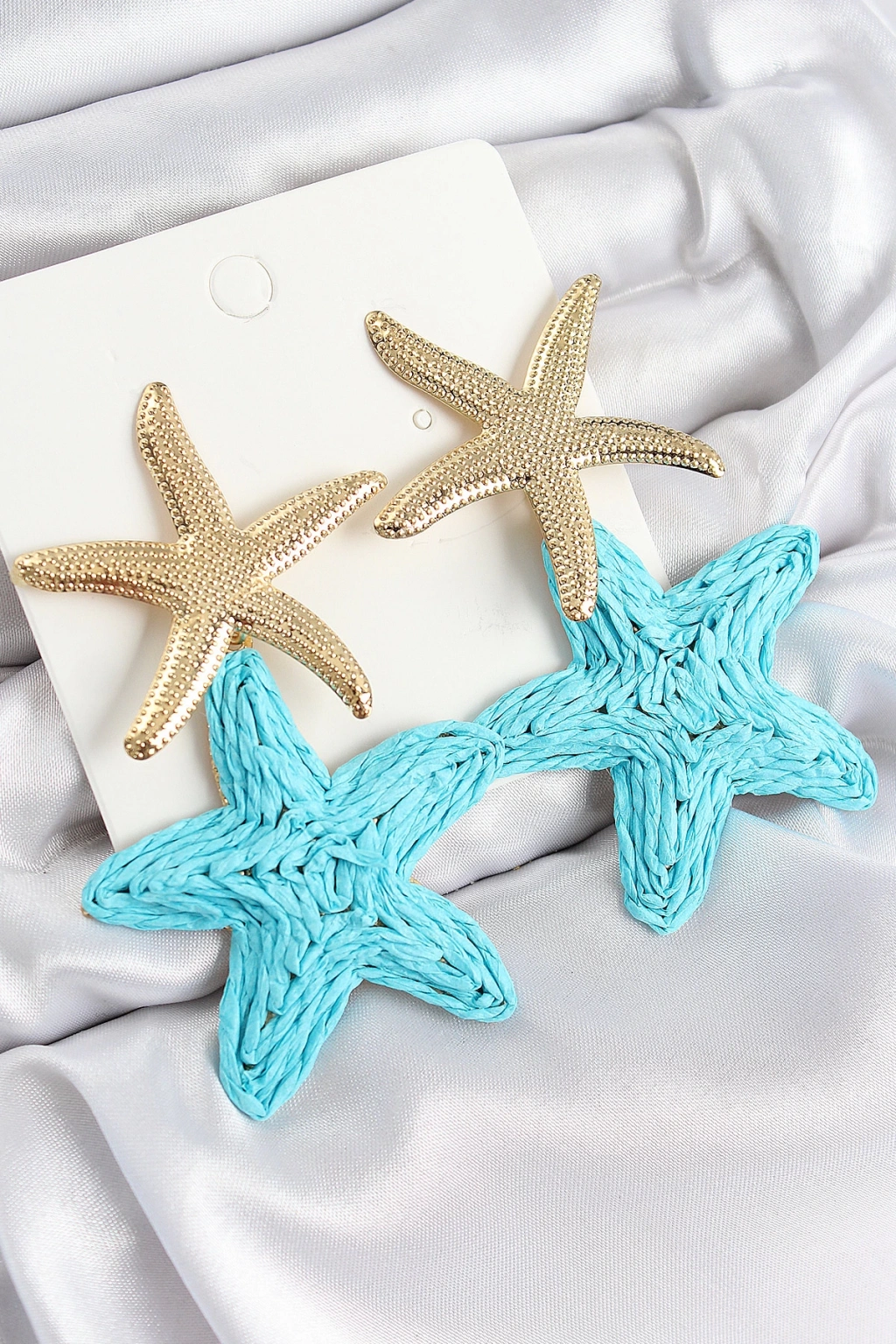 Pirinç Sallantılı Turkuaz Deniz Yıldızı Model Gold Renk Hasır Küpe - TJ-BKP11027