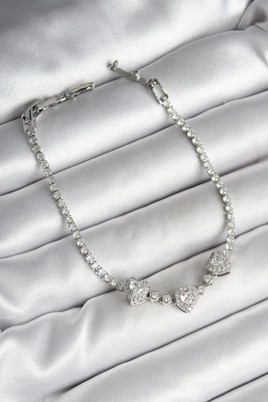 Pirinç Sıralı Kalp Figürlü Zirkon Taşlı Gümüş Renk Kadın Bileklik - TJ-BB6980