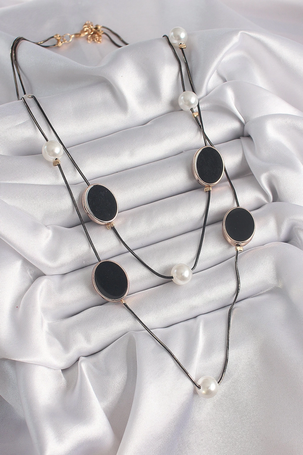 Pirinç Siyah Renk Zincir İnci Detaylı Çoklu Kadın Kolye - TJ-BKO9621