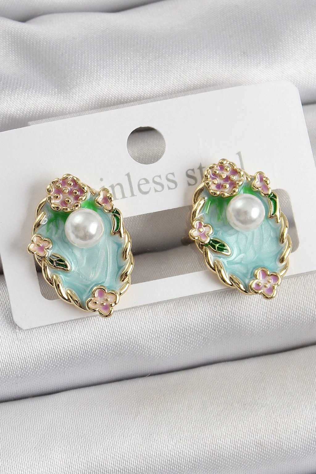 Pirinç Yeşil Mineli İnci Detaylı Sanatsal Portre Model Gold Renk Kadın Küpe - TJ-BKP10691