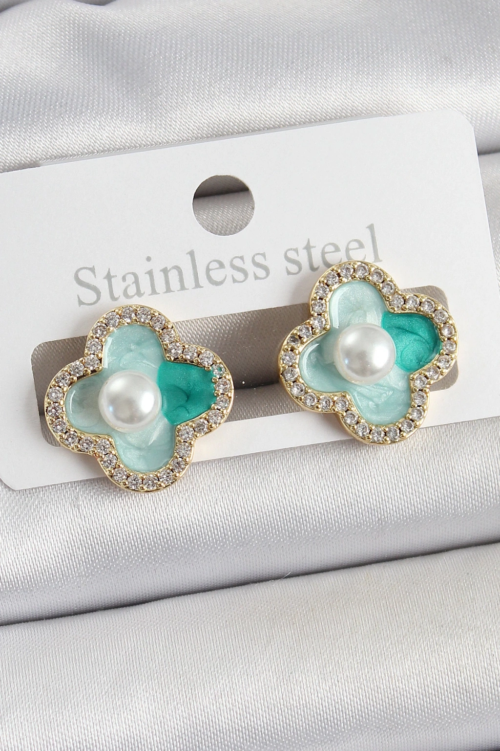 Pirinç Yeşil Mineli İnci Detaylı Zirkon Taşlı Sanatsal Portre Yonca Model Gold Renk Kadın Küpe - TJ-BKP10681