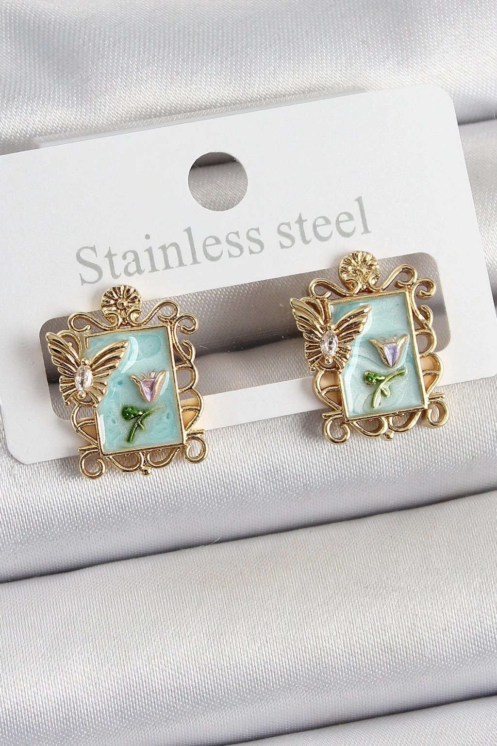 Pirinç Yeşil Mineli Sanatsal Portre Model Gold Renk Kadın Küpe - TJ-BKP10684