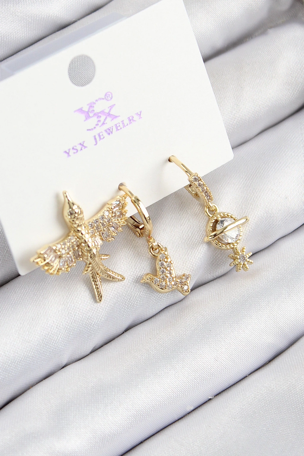Pirinç Zirkon Taşlı 3'lü Kuş Model Gold Renk Kadın Küpe - TJ-BKP11133
