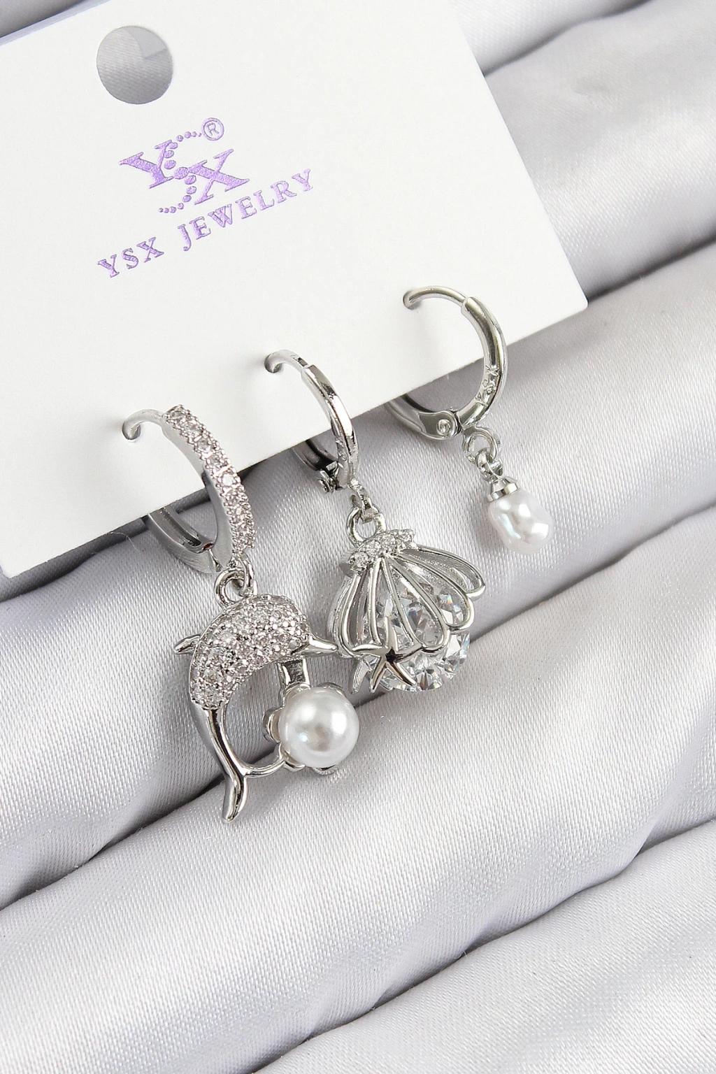 Pirinç Zirkon Taşlı 3'lü Yunus Balığı Ve İstiridye Model Gümüş Renk Kadın Küpe - TJ-BKP11127